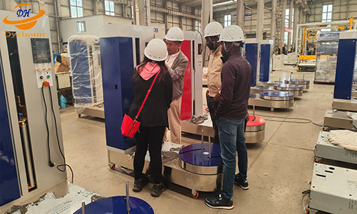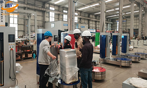 Nick先生和Angela小姐向客戶詳細介紹了行李纏繞機的操作流程和使用方法,并由客戶現場操作。佳森生產的行李纏繞機使用起來非常簡單,打開包裝插上電源即可使用,機器標準電壓為220V或110V 50Hz/60Hz。