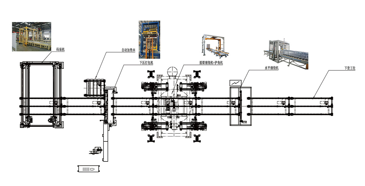 板材產(chǎn)品-自動(dòng)碼垛-墊塊自動(dòng)供料系統(tǒng)一捆扎機(jī)打包-六面包裝系統(tǒng)-叉車(chē)入庫(kù)