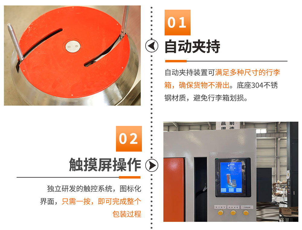 然后操作人員按操作面板上的啟動按鈕,設(shè)備自動進(jìn)行包裝,一般行李包3—5層即可!包裝完畢后,操作人員手工切斷薄膜,然后取走行李!
