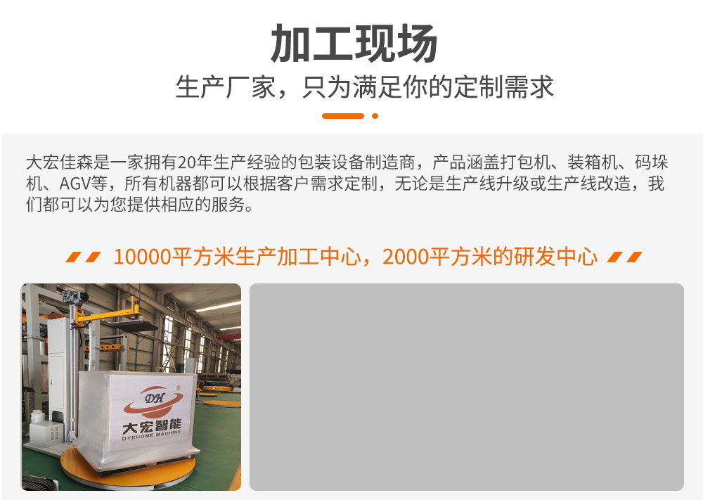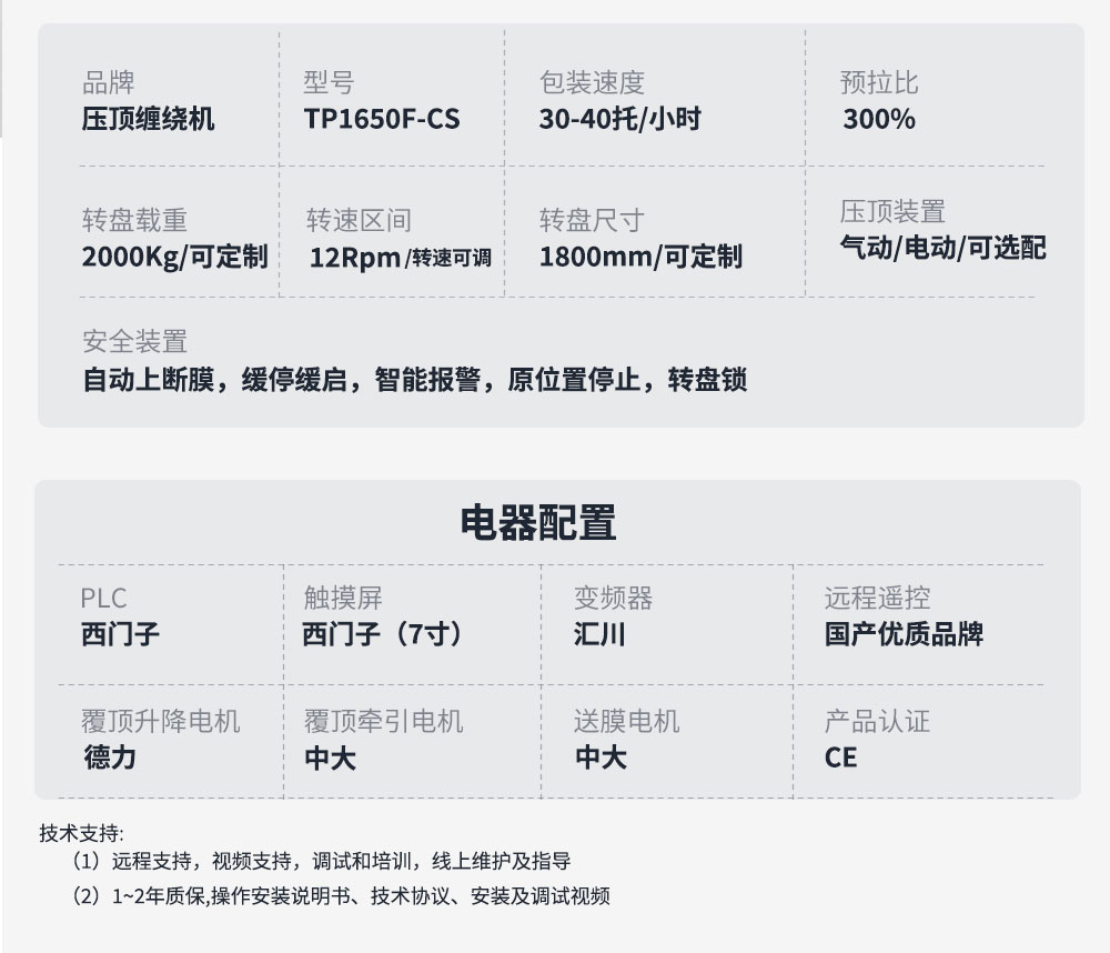 大宏佳森壓頂型托盤纏繞機TP1650F-CS采用電動加壓裝置,全程壓頂,針對于單個貨物較輕及碼垛較高的托盤纏繞,
