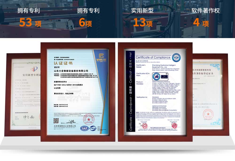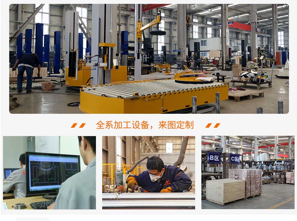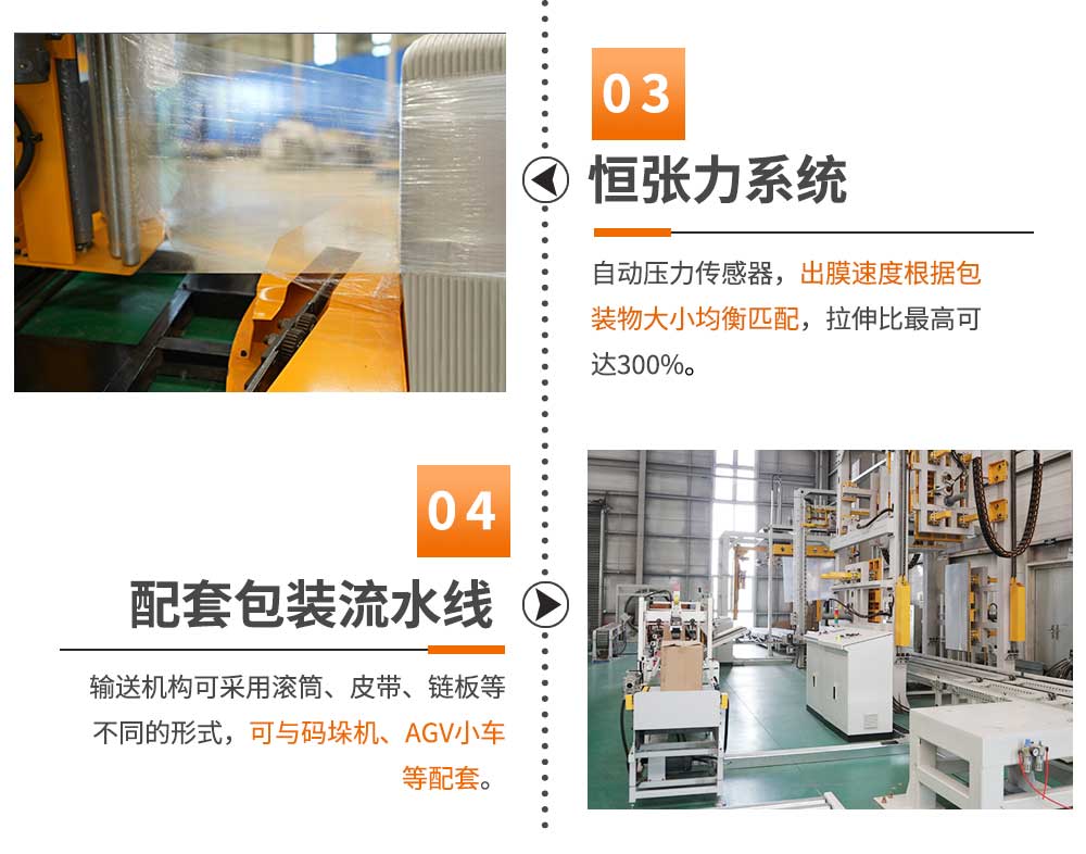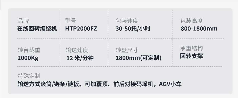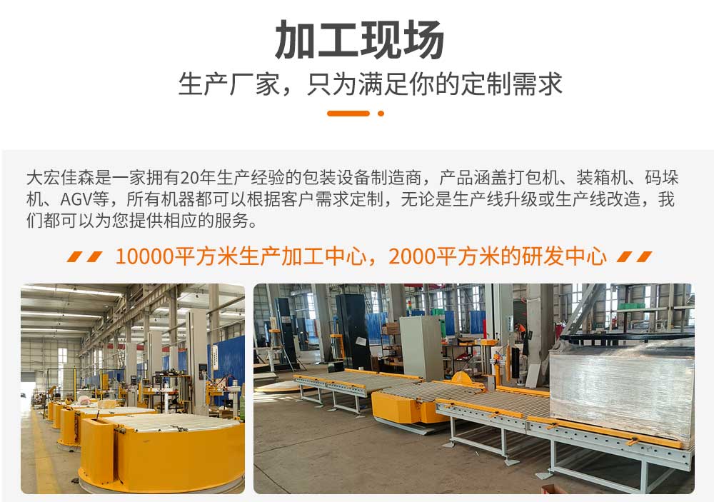 大宏佳森在線回轉纏繞機HTP2000FZ,主要適用于生產量大、物流效率較高的現代化作業,滿足較輕或較重貨物的包裝要求。
